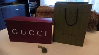Elegante caja de la marca Gucci en color rojo , viene con dos fundas con el texto Gucci también para cada zapatilla - Diseño distintivo de la marca.
