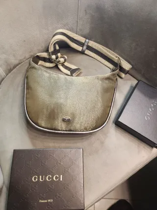 Bolso de la marca Gucci con un diseño elegante y moderno. - Correa ajustable con rayas. - Acabado metálico en los bordes.