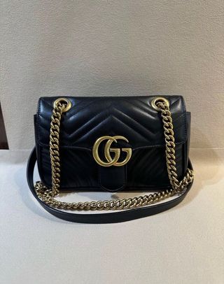 Bolso de mano Gucci Marmont con cadena. Pertenece a la línea de bolsos de gama media-alta de Gucci y es uno de los modelos clásicos más populares de la marca, convirtiéndose en una opción representativa de bolsos de lujo accesible gracias a su diseño retro y practicidad. - Diseño acolchado. - Detalle de doble G en dorado. - Cadena metálica dorada.