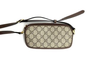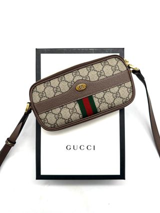 Este bolso Gucci modelo Ophidia en versión mini está confeccionado en la icónica lona GG Supreme beige/ébano con detalles en piel marrón, herrajes dorados y la emblemática franja verde y roja en el frontal. Compacto y ligero, es ideal como bolso cruzado para llevar lo esencial con estilo y distinción. Con unas medidas de 21 cm de ancho, 11 cm de alto y 1 cm de profundidad, este bolso Gucci de segunda mano se encuentra en excelente estado y conserva su caja original. Una pieza práctica, elegante y muy deseada dentro de la colección de bolsos Gucci de lujo de segunda mano. Barcelona 0517