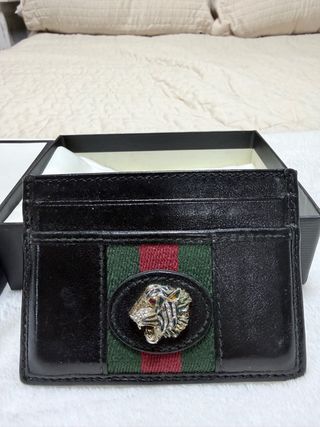 Elegante tarjetero de la marca Gucci. - Diseño en piel negra. - Tira central con los colores de la marca. - Detalle de cabeza de tigre con incrustaciones.