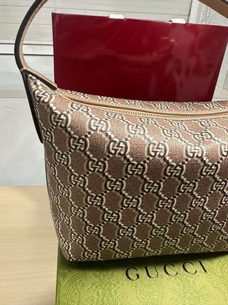 Bolso tipo bandolera de la marca Gucci con el clásico estampado GG. - Color: beige y marrón. - Incluye funda guardapolvo con logo de Gucci.