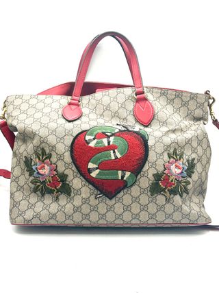 Bolso Gucci Ophidia Tote original de segunda mano, en lona GG Supreme beige con detalles de piel roja y bordados de corazón, serpiente y flores. Diseño llamativo y elegante, con asas y bandolera para llevar al hombro o cruzado. Medidas: 37x28x16 cm. Interior amplio, ideal para uso diario o viajes cortos. Bolso Gucci auténtico en excelente estado, sin marcas visibles de uso. Pieza de lujo única y difícil de encontrar. Barcelona 0515