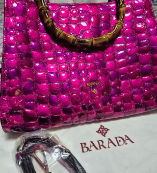 Bolso espectacular de la marca Barada con un diseño único. - Acabado en piel con textura de cocodrilo. - Tonos vibrantes entre rosa y morado. - Asa de bambú ( Gucci ) - Cierre con solapa.