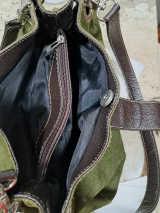 Elegante bolso de ante en color verde con detalles en piel marrón. - Cierre principal con solapa y hebilla metálica. - Asa de hombro ajustable. - Detalle de logo GUCCI en la hebilla.