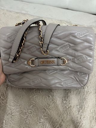 Bolso de mano Guess original con un diseño acolchado y detalles en cadena dorada. El color gris le da un toque elegante. - Diseño acolchado con monograma. - Cadena dorada para llevar al hombro. - Cierre de solapa.