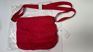 bolso de tela rojo con etiquetas