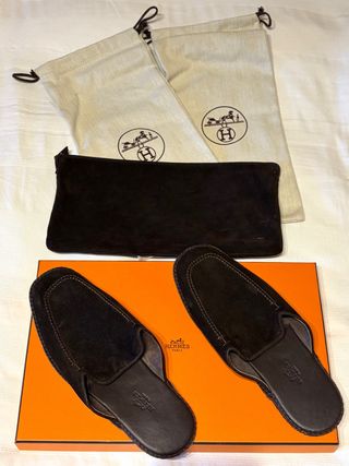 Elegantes zapatillas de ante de la marca Hermes. - Color marrón. - Incluye bolsa guardapolvo.