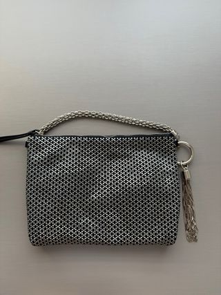 Precioso bolso de noche Jimmy Choo, ideal para ocasiones especiales. Es un bolso elegante y llamativo. Con ticket de compra en la boutique de Madrid. Vendo porque estoy renovando mi armario - Confeccionado con pedrería negra y plateada. - Asa de cadena metálica. - Incluye un pequeño borlón.