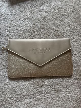 ☆ Totalmente Nuevo!! ☆ Precioso neceser de Jimmy Choo. Ideal para guardar perfumes o maquillaje. - Elegante diseño en forma de sobre. - Combina un tono rosa empolvado con detalles dorados brillantes. - Incluye un pequeño ancla dorada como adorno.