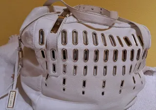 Elegante bolso de la marca Jimmy Choo. - Diseño en color blanco con detalles dorados. - Acabado con múltiples ojales metálicos.