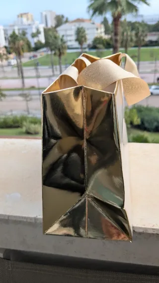 Bolso de mano Jimmy Choo original, en acabado dorado brillante con placa frontal metálica grabada. Pieza icónica y atemporal, perfecta para eventos especiales, fiestas, galas o bodas. Estado impecable, sin signos de uso apreciables. Usado únicamente en una ocasión. Conserva toda la estructura rígida, brillo uniforme y detalles metálicos como nuevos. Modelo de alta gama, actualmente difícil de encontrar en tienda. PVP aproximado en boutique: 500–600 €. Es un accesorio elegante, sofisticado y con el sello inconfundible de Jimmy Choo.