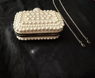 Elegante bolso de mano de la firma Jimmy Choo, perfecto para ocasiones especiales, fue un regalo y está sin usar - Diseño cubierto de perlas - Detalle de perla para apertura - incluye cadena metálica para hombro