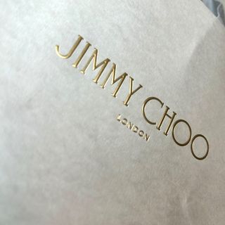 Bolsa de papel original de tienda JIMMY CHOO, utilizada en boutiques oficiales. Diseño sofisticado, perfecta para presentación de regalos, decoración o colección.
