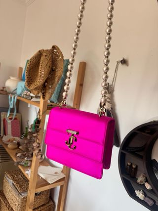Elegante bolso de la marca Jimmy Choo en un vibrante color rosa. Su diseño sofisticado lo hace perfecto para cualquier ocasión. - Cadena de perlas para llevar al hombro. - Cierre con broche. - Logo metálico de la marca.