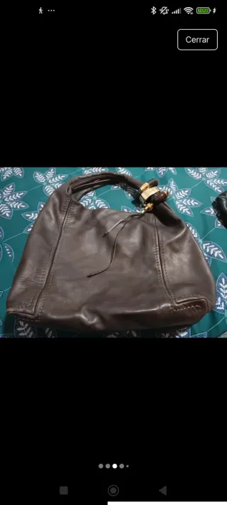 Bolso de cuero de color marrón, con un diseño elegante y moderno. - Material: Cuero genuino. - Asas con detalles metálicos dorados. - Cierre superior. - Interior espacioso.