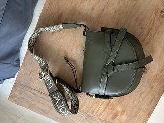 Bolso bandolera de la marca Loewe en un tono verde oliva. - Diseño minimalista y elegante. - Correa ajustable con nudo. - Logo de la marca grabado.