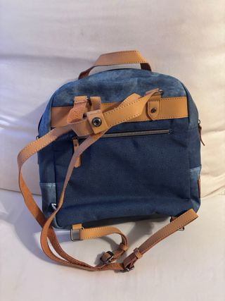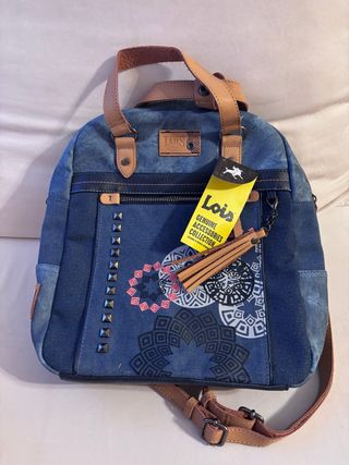 Bolso mochila de la marca Lois, perfecto para el día a día. - Diseño en tejido denim con parches y estampados geométricos. - Detalle de tachuelas metálicas. - Asas de mano y correa ajustable. - Incluye etiqueta original. Totalmente nueva