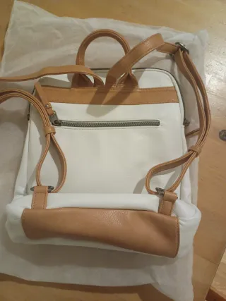Mochila de polipiel Lois Jeans en color blanco con detalles en marrón. - Medidas 26.5x33x8.5cm - Diseño con bordado frontal. - Asa superior. - Cierre de cremallera. - Esta nueva en su bolsita