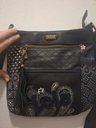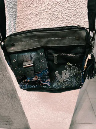 Bolso bandolera de la marca Lois. - Diseño con parches y bordados. - Cierre de cremallera. - Correa ajustable. Esta desgastado por eso tiene este precio. Tiene una cremallera que le falta un diente pero cierra perfectamente.