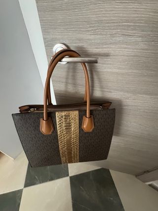 Bolso marrón Michael Kors auténtico, con etiquetas y código QR en su interior. Se vende cob su bolsa de tela o guardapolvo original. Interior de piel vuelta con bolsillo pequeño, asa de piel con adornos dorados y llavero con la insigniade Michael Kors. Se cierra automaticamente mediante sistema de imán. Bien conservado, comprado en 2022 en El Corte Inglés por más de 200€.
