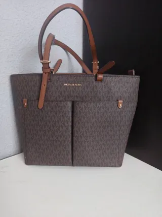 Bolso de mano Michael Kors con un diseño clásico y elegante. - Estampado MK característico. - Asas de cuero marrón. - Bolsillos exteriores. - Detalle metálico con el logo.