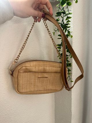 Bolso bandolera de la marca Paco Martinez, con un diseño tejido muy veraniego. - Material exterior tejido. - Correa combinada de piel y cadena dorada.