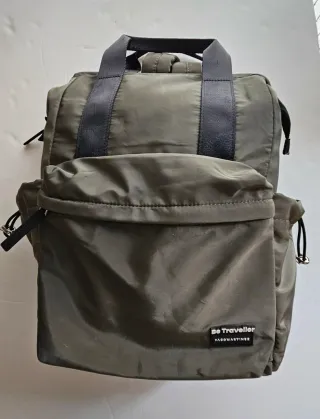 Mochila de nylon de la marca Paco Martínez en un tono verde oliva. Diseñada para llevar el portátil de hasta 15". - Compartimento principal espacioso y acolchado para llevar un portátil de hasta 15" o una tablet. - Bolsillo frontal amplio y trasero para poner cosas importantes que no queden expuestas a posibles robos con cierre de cremallera. - Bolsillos laterales. - Asas ajustables. - Asa para colocar la mochila en el trolley de una maleta. Está usada y por eso tiene algunas marcas en el tejido.