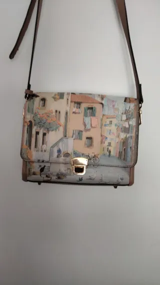 Bolso de hombro con un diseño artístico que evoca un pintoresco pueblo. - Cierre metálico dorado. - Correa ajustable. - Estampado detallado de casas, ropa tendida y animales.