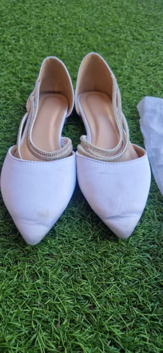 Elegante conjunto de zapatos y bolso de raso blanco número 39. - Zapatos planos con detalle de imitación pedrería. - Bolso de mano con diseño plisado, con cadena para poder colgarlo al hombro. Las punteras están algo arrugadas y están un poco manchadas. Por dentro están practicamente nuevos. El bolso tiene una mancha. Ideal para quien sepa limpiar el raso o quiera teñirlo.