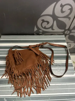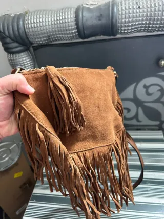 Bolso bandolera de ante con flecos Parfois. Dimensiones: alto 15 cm, largo 23 cm. Está en muy buena condición. Hago envíos