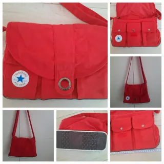Bolso de tela Converse en color rojo, con un diseño inspirado en zapatillas. Este bolso bandolera rojo es un producto de la marca Converse, diseñado con el estilo icónico de su línea Chuck Taylor All Star. - Cierre principal con solapa. - Múltiples bolsillos exteriores. - Correa ajustable para llevar al hombro. - Detalle de suela de zapatilla en la base.