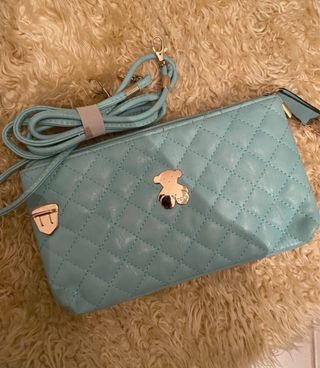 Bolso de mano Tous con un diseño acolchado y un detalle metálico. Le falta la cremallera de atras - Color azul claro. - Adorno con el oso Tous. - Cremallera superior. - Correa desmontable.