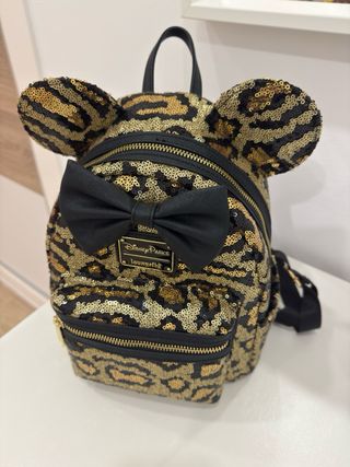 Bolso de Loungefly con diseño de Minnie Mouse y estampado de leopardo. - Detalles de lentejuelas doradas y negras. - Orejas de Minnie y lazo negro. - Compartimento frontal con cremallera.