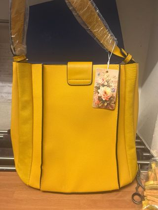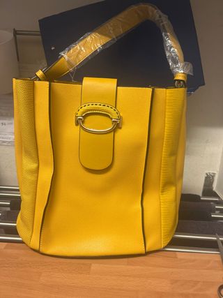Bolso de mano en llamativo color amarillo. Presenta un diseño moderno con detalles texturizados en los laterales. - Cierre con solapa y detalle metálico. - Asa de mano. - Material con acabado texturizado en los laterales.