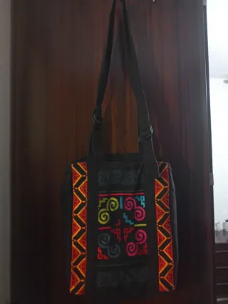 Bolso de hombro con un diseño bordado tradicional de Mongolia. Presenta un patrón circular central y detalles en los laterales. - Bordado intrincado en tonos rojos y verdes. - Tejido de color burdeos. - Dos asas para llevar. - Bolsillos laterales con fruncido. - Etiqueta 'Made in Mongolia'. - Bolsillos interiores. - Divisiones.