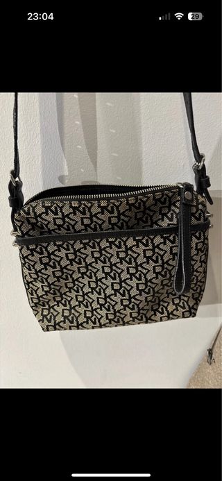 Bolso DKNY con un diseño de monograma. - Combinación de colores beige y negro. - Correa ajustable para llevar al hombro. Usado pocas veces