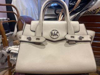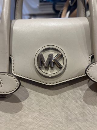 Elegante bolso de mano Michael Kors en color beige con detalles plateados. Un accesorio sofisticado para tu día a día. - Diseño estructurado. - Cierre de botón a presión. - Asa superior. - Logo metálico frontal.