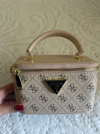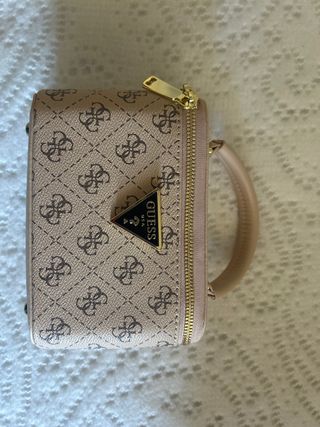 Bolso de mano Guess con un diseño elegante y moderno. Perfecto para complementar cualquier atuendo. - Estampado con el logo de la marca. - Detalle de triángulo con el logo en la parte frontal. - Cierre de cremallera dorada. - Asa corta para llevar en la mano.