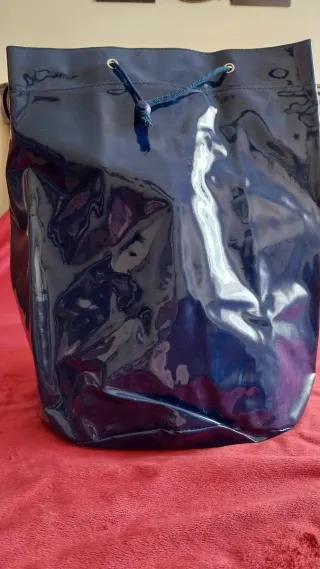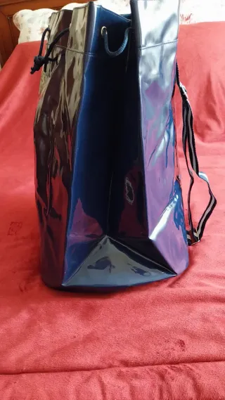 Bolso de material brillante con un diseño moderno y práctico. - Cierre de cordón. - Dos asas de tela con rayas.