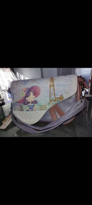 Bolso mediano con estampado de flores y mosaicos en tonos azules y rosas, como nuevo. El asa se puede ajustar y quitar. Tiene la cremallera principal y varias pequeñas. Perfecto estado.