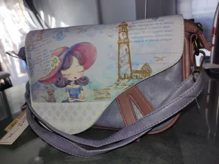 Bolso bandolera con un encantador diseño. - Ilustración de una chica con sombrero y un faro. - Correa tejida. - Cierre de solapa.