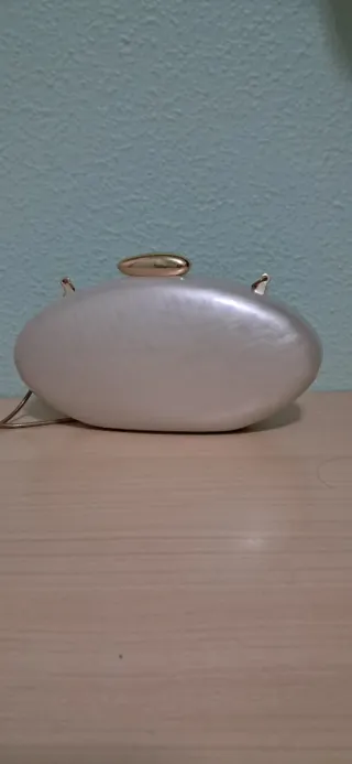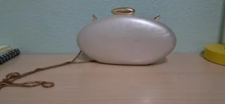 Bolso de mano tipo clutch en color nacarado/perla con acabado brillante. Incluye cadena dorada desmontable para llevar al hombro. Cierre superior metálico dorado. Ideal para bodas, fiestas y eventos especiales. Elegante y fácil de combinar. Capacidad para móvil, llaves y pequeños esenciales. Estado: muy bueno. Precio: 12 € 📦 Envío 💬 Para cualquier duda, escríbeme sin problema