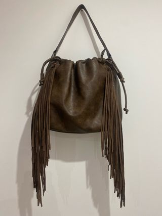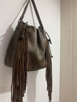 Bolso de estilo boho con un diseño único y llamativo. - Material: Piel sintética. - Cierre: Fruncido con cordón. - Adorno: Flecos largos decorativos. - Correa: Ajustable para llevar al hombro. El bolso está sin estrenar nuevo!!