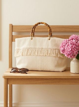 Bolso de tela con un bonito diseño y asa de bambú. - Asa de bambú. Correa para hombro - Detalle de flecos en la parte superior. - Color crema .
