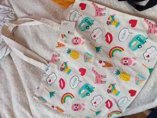 Bolso tote de tela con un estampado alegre y colorido. Kawaii cute - Diseño con dibujos de piñas, flamencos, caravanas y labios. - Asas cómodas para llevar al hombro.