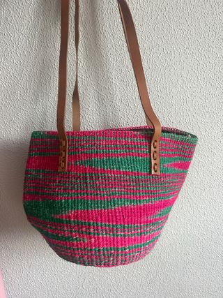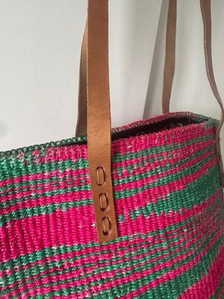 Bolso capazo con un diseño tejido a rayas. - Asas de cuero. - Tejido de fibras naturales.