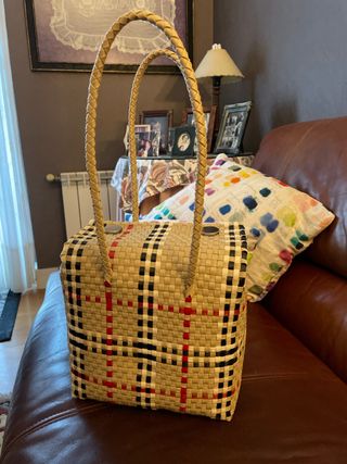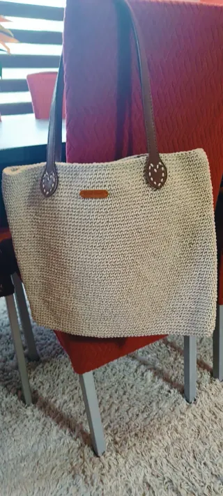 Se puede llevar con asa corta (doble) o larga. Tiene dos compartimentos Asa corta 27 cm aprox Asa larga 50 aprox Ancho bolso 25 cm Alto bolso 15 cm Fondo bolso 5,5 cm Tiene marcas de uso en las esquinas, visible en las fotos