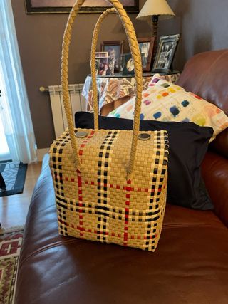 Bolso de piel con un diseño tejido muy original. Es un accesorio elegante y práctico. - Medidas: 28x19cm. - Material: Piel. - Color: Marrón rojizo.