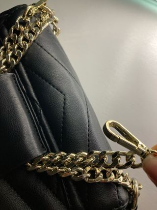 Elegante bolso de mano en color negro. Su diseño acolchado le da un toque moderno y sofisticado. - Acabado acolchado. - Cadena decorativa. - Logo metálico dorado.